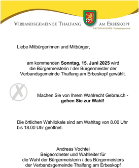am kommenden Sonntag, 15. Juni 2025 wird die Bürgermeisterin /