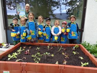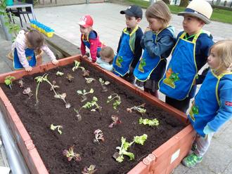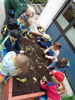 Auch dieses Jahr wurde mit Unterstützung von einer Mitarbeiterin der Edeka Stiftung unser Hochbeet mit Salat, Gurken, Radieschen bepflanzt und Möhren gesät.
