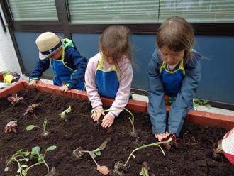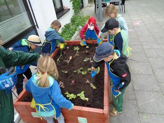 Die Kinder, die 2025 eingeschult werden, haben die Setzlinge eingepflanzt und erfahren durch diese Aktion, wo unser Gemüse und unser Salat herkommt (nicht aus dem Geschäft vom Gemüseregal) und was die Pflanzen zum Wachsen benötigen (Wärme, Licht und Wasser).