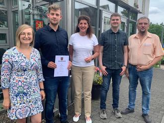 v.l.n.r: Ausbildungsbeauftragte Hannah Klein, Inspektoranwärter Joshua Meyer, Bürgermeisterin Vera Höfner, Büroleiter Darius Schürmann und Personalratsmitglied Christian Neumann