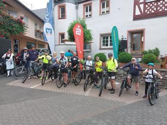 Radler beim Auftakt in Kröv mit Bürgermeister Marcus Heintel (3. vl) und 1. Beigeordnetem Alex Licht (6. vl). Bildquelle: Kreisverwaltung Bernkastel-Wittlich