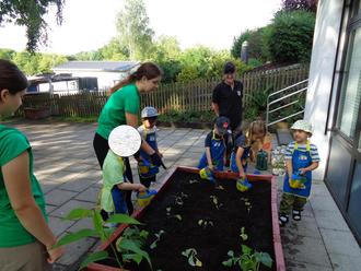 Zunächst wurde das Wissen der Kinder auf den Prüfstand gestellt. Das Personal staunte, denn da war schon so Einiges vorhanden. Dann durften die Kinder die Erde umgraben, was ein Mordsspaß war. Im Anschluss daran wurden die Pflanzen vorsichtig eingesetzt und gegossen. Nebenbei wurde spielerisch das Wissen der Kinder erweitert. So lernten sie z.B. dass Regenwürmer nützlich für unseren Garten sind oder dass Pflanzen am liebsten morgens oder abends gegossen werden wollen.