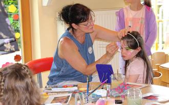 In der Kita war was los! Die Kinder wurden geschminkt, es galt Tattoos und Buttons zu machen. In den Räumlichkeiten der Kita konnten sich die Gäste über das „Kita-Leben“ informieren und in Erinnerungen schwelgen. Viele Gäste sind nach vielen Jahren zum ersten Mal wieder in die Kita gekommen und konnten sich noch an so manches erinnern.