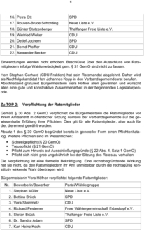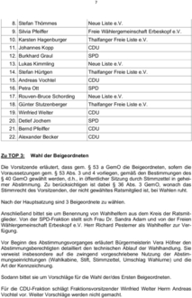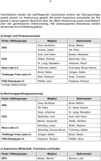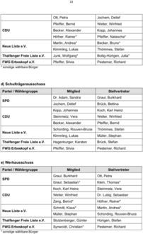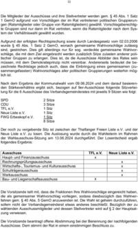 In analoger Anwendung des § 45 GemO entfallen auf SPD, CDU, Thalfanger Freie Liste e.V. und die Neue Liste e.V. jeweils 1 Vertreter.