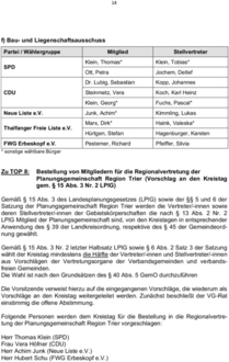 | Zu TOP 8: | Bestellung von Mitgliedern für die Regionalvertretung der Planungsgemeinschaft Region Trier (Vorschlag an den Kreistag gem. § 15 Abs. 3 Nr. 2 LPlG) |