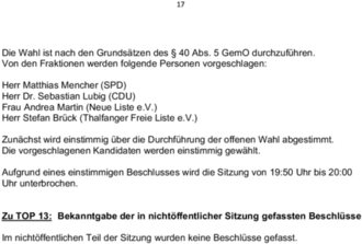 | 13. | Bekanntgabe der in nichtöffentlicher Sitzung gefassten Beschlüsse |