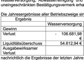 Den Prüfungsberichten ist zu entnehmen, dass die Jahresabschlüsse der Betriebszweige Wasserversorgung, Abwasserreinigung und Wärmeversorgung für das Jahr 2021 den uneingeschränkten Bestätigungsvermerk erhalten.