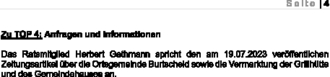 Das Ratsmitglied Herbert Gethmann spricht den am 19.07.2023 veröffentlichen Zeitungsartikel über die Ortsgemeinde Burtscheid sowie die Vermarktung der Grillhütte und des Gemeindehauses an.