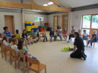 Sehr begeistert waren die Zahlenkinder von den zahlreichen Besuchen und Ausflügen zur Erweiterung der Lebensumwelt. Es besuchten uns wichtige Institutionen, wie z.B. Polizei, Teddypraxis und DRK. In Thalfang erkundeten wir ebenso wichtige Anlaufstellen wie z.B. Feuerwehr, Bücherei, Wochenmarkt, Rathaus mit Ortsbürgermeister und VG-Bürgermeisterin, Schwimmbad und Bauernhof Manz (Hochwald Foods GmbH) in Talling. Dabei lernen die Kinder spannende Orte und auch deren Inhalte kennen, und verlieren somit eventuelle, unbegründete Scheu davor. Die Zahlenkinder legten bei den Ausflugszielen auch Wert auf Genuss. So gingen wir Eis und Pizza essen und besuchten den dörflichen Spielplatz.