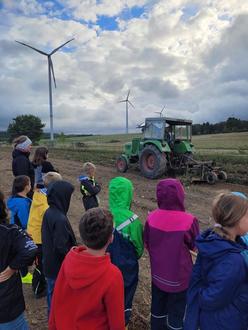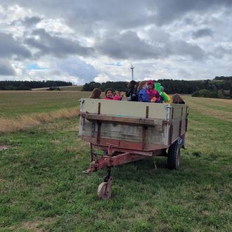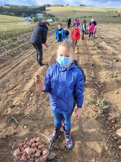 Mit dem Traktor-Anhänger-Taxi wurde die Klasse auf der Kreuzwies abgeholt und zum Flur gefahren. Bewaffnet mit Körben, Gummistiefeln und Matschhosen ging es auf´s Kartoffelfeld. Der Bauer Hubert Lorscheter holte die Knollen mit dem Traktor und einer Maschine aus der Erde. Anschließend gingen die Kinder die einzelnen Reihen ab und sammelten die Ernte mit ihren Händen auf. Das Wetter zog sich langsam etwas zu, sodass sich alle vor dem Regen in ein kleines Waldstück retteten. Hier krönten wir unsere Kartoffelkönige, den Finder der dicksten und die Finderin der kleinsten Kartoffel. Barbara Lorscheter überraschte uns mit leckeren Kartoffelecken, Gemüse-Sticks, Dip und Nachtisch.