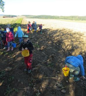 In Bäsch angekommen und ausgestattet mit Eimern und Gummistiefeln wanderten wir zum Kartoffelacker. Nach dem Picknick bei Sonnenschein schauten wir gespannt zu, wie Opa Schmidt mit dem Traktor und dem Kartoffelroder die Kartoffeln aus der Erde holte, damit wir sie anschließend mit Oma Schmidt und Mama Corinna auf dem Feld wie früher mit der Hand aufheben und in Körben sammeln und sortierten konnten - Speisekartoffeln, kleine Setzkartoffeln, Schweinekartoffeln. Da Arbeit hungrig macht, versorgten uns Corinna und Robin in einer kleinen Pause mit Leckereien.