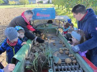 Später kam dann sogar der Vollernter - wie heute - zum Einsatz. Alle Kinder durften aufsteigen und mitfahren und interessiert bestaunen, wie damit die Kartoffeln geerntet werden.