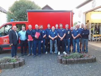 Erster Beigeordneter Andreas Vochtel, Wehrleiter Ralf Mattes sowie die Feuerwehrkameraden der Freiwilligen Feuerwehr Schönberg gratulieren René Prümm zur Wahl und wünschen ihm für die neue Aufgabe alles Gute und viel Erfolg.