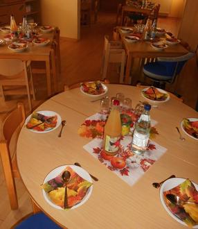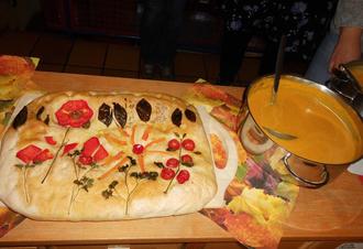 Nach einem gemeinsamen Sing- und Spielkreis wurde den Eltern ein leckeres Menü serviert. Dieses wurde aus den zuvor geernteten und gespendeten Gemüse- und Obstsorten von den Kindern zubereitet. Es gab eine leckere Gemüsesuppe, dazu ein frischgebackenes Brot und ein selbstgekochtes Apfel-Birnenmus!