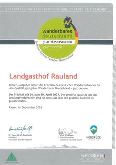 Der Landgasthof Rauland in Thalfang erhielt erneut das Gütesiegel „Qualitätsgastgeber Wanderbares Deutschland“. Der Landgasthof trägt seit 2010 diese besondere Gütesiegel.