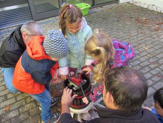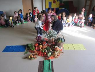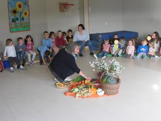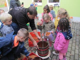 Zur Vorbereitung auf das Erntedankfest behandelten alle Gruppen das wunderschöne Thema "Apfel". Es wurden Lieder gesungen, Fingerspiele gespielt und kreativ zur Thematik geschafft. Als Höhepunkt kelterten die Kinder am 04. Oktober mit den Papas Matthias und Thomas Apfelsaft aus den heimischen Äpfeln unserer Apfelbäume. Dies war eine tolle und elementare Erfahrung für die Kinder der Kita, die sicherlich lange in Erinnerung bleibt. Am 10. Oktober besuchte uns Frau Fortuin in der Kita, um gemeinsam mit uns das Erntedankfest zu feiern. Es wurde eine schöne Mitte gestaltet und die Sinnhaftigkeit dieses Festes kindgerecht vermittelt. Alle Kinder wussten, dass wir jeden Tag aufs Neue dankbar sind, für all die guten Gaben, die wir haben. Genauso, dass die Saaten Licht und Wärme, nährreicher Boden, Wasser und nicht zuletzt Liebe brauchen, damit sie gedeihen können. Zum Abschluss durften alle Kinder gemeinsam an langen Tafeln eine köstliche Erntedanksuppe genießen. Die Bewusstheit, dankbar für das tägliche Essen und die Natur, die uns so reichlich beschenkt, zu sein, konnte bei den Kindern durch die Aktivitäten und die gemeinsame Feier gefestigt werden. Abschließend sprechen wir Frau Fortuin ein herzliches Dankeschön für die schöne Feier und die gute Zusammenarbeit in den letzten Jahren aus und wünschen ihr für die Zukunft alles Gute.