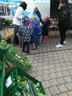Welches Obst und Gemüse gibt es? Warum sind manche Eier weiß und manche braun? Aus was wird Honig gemacht? Diese und viele weitere Fragen wurden den Kindern der KiTa Regenbogen von den Wochenmarkt-Ausstellern beantwortet. Natürlich durften sie dabei die Produkte des Marktes probieren.