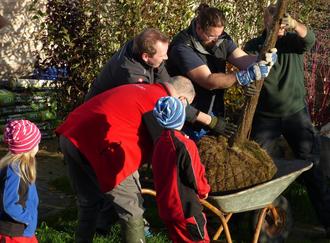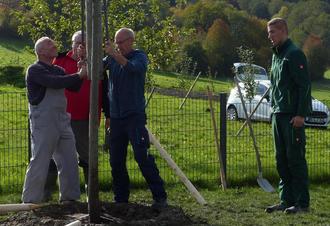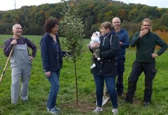 Der erste Obstbaum für die Neugeborenen im Ort ist gepflanzt