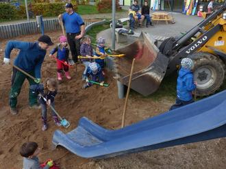 Der große Sandkasten wird leergeschaufelt, um Platz für neuen Sand zu schaffen.