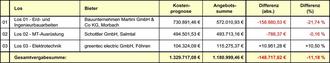 Die Gesamtauftragssumme für die 3 zu vergebenden Lose liegt mit 1.180.999,46 € (brutto, incl. 19% MwSt.) ca. 11,18 % (rund 148.717,62 €) unter der Kostenprognose.