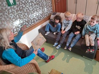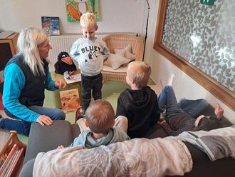 Im „Sternenzimmer“ wurde ein gemütlicher Vorleseraum eingerichtet. Eine Couch, Kissen und gedämpftes Licht sorgten für eine besonders einladende Atmosphäre, in der die Kinder aufmerksam den Geschichten lauschen konnten. Die Handpuppe „Rabe Socke“ war zu Besuch und die Kinder hatten viel Spaß beim gemeinsamen lesen.