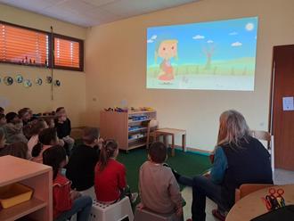 Die Kinder konnten so die Geschichten als großes Bild eindrucksvoll betrachten und hören- fast wie im richtigen Kino.