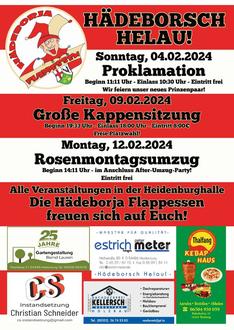 Eintrittskarten für die Kappensitzung können noch bis zum 03.02.2024 im Gasthaus „Zur Linde“ in Heidenburg und an der Prinzenproklamation am 04.02.2024 erworben werden. Eventuelle Restkarten dann an der Abendkasse.