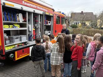 In den letzten Wochen haben wir in der Grundschule Heidenburg wieder viel erlebt. Die dritte Klasse hat im Sachunterricht das Thema „Feuer“ behandelt und in diesem Rahmen die Feuerwehr Heidenburg besucht. Der Opa einer Schülerin zeigte uns das Feuerwehrauto, beantwortete unsere Fragen und erzählte uns von seinen Aufgaben als Feuerwehrmann. Anschließend durften wir eine Runde mit dem Feuerwehrauto fahren und die Ausrüstung anprobieren. Der Helm und die Jacke waren ganz schön schwer! Vielen Dank für den interessanten Einblick in die Arbeit der Freiwilligen Feuerwehr!
