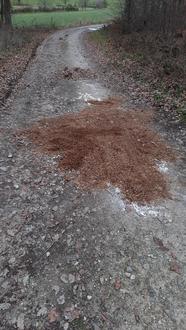 Es ist schon sehr dreist, den kompletten Inhalt (Knauf Quarzgrund) der Eimer auf dem Weg liegen zu lassen und diesen im Anschluss lediglich mit Hackschnitzeln abzudecken. Ganz abgesehen davon, dass die Nutzung dieses Weges nur dem Forst- und Landwirtschaftlichen Verkehr und nicht einem Baustellenlieferservice gestattet ist.