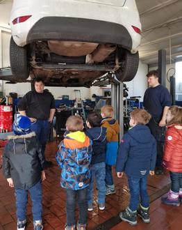 Da gerade ein Auto auf der Hebebühne stand, konnten die Kinder es von unten anschauen. Auch ein ausgebauter Motor war ein besonderes Highlight.