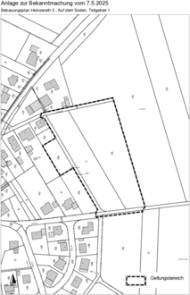 Der Gemeinderat Morbach hat am 11.2.2025 beschlossen, im Ortsbezirk Heinzerath für das in der nachstehend abgedruckten Karte abgegrenzte Gebiet den Bebauungsplan „Heinzerath II – Auf dem Soden, Teilgebiet 1“ aufzustellen. Durch die Bebauungsplanung soll verbindliches Baurecht für neue Wohnbauflächen geschaffen werden. Gemäß § 2 Absatz 1 Baugesetzbuch wird der Beschluss, einen Bebauungsplan aufzustellen, hiermit ortsüblich bekanntgemacht.