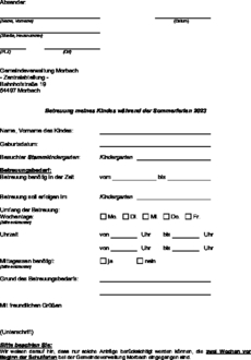 Die Gemeinde Morbach bietet bei Bedarf eine durchgehende Betreuung der Kindergartenkinder während der Sommerferien 2023 an. Sollte ein Betreuungsbedarf während dieser Zeit bestehen wird darum gebeten, dies mit nachstehendem Vordruck mitzuteilen. Es ist zu gewährleisten, dass das Kind während des Kindergartenjahres mindestens einmal zusammenhängend zwei Wochen Ferien beansprucht und in dieser Zeit den Kindergarten nicht besucht.
