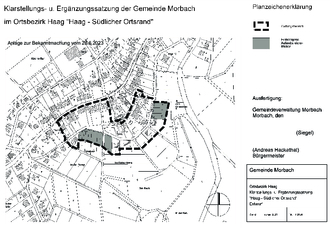 Der Beschluss des Gemeinderates Morbach, die Klarstellungs- und Ergänzungssatzung „Haag – Südlicher Ortsrand“ aufzustellen, wird hiermit gemäß § 2 Absatz 1 Baugesetzbuch ortsüblich bekanntgemacht. Der Gemeinderat Morbach hat am 25.4.2023 dem Satzungsentwurf zugestimmt. Die Abgrenzung des Satzungsgebietes ist nachstehend abgedruckt.
