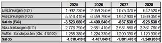 Der Finanzmittelfehlbetrag in Höhe von -3.926.880 € und die Tilgungsrate von 156.200 € kann durch die Einzahlung liquider Mittel aus den Vorjahren in Höhe von 4.083.080 € aufgefangen werden.