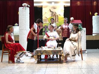 Im Juni brachten die 20 Schülerinnen und Schüler der Theater AG sen. des Nikolaus-von-Kues-Gymnasiums in Bernkastel-Kues Dürrenmatts „Romulus der Große“ zur Aufführung – keine leichte Aufgabe, denn es handelt sich um ein anspruchsvolles Stück. Sowohl der Inhalt als auch der Textumfang waren eine Herausforderung, welche die jungen Schauspielerinnen und Schauspieler im Alter von 13 bis 19 Jahren zu Beginn des Schuljahres auf sich genommen hatten. Aber sie meisterten diese Herausforderung mit Bravour. Mit unglaublicher Textsicherheit und einer riesigen Spielfreude bewältigten sie das Stück und erfreuten die Zuschauer in vier ausverkauften Vorstellungen im Atrium des Gymnasiums. „Wir können unsere Schülerinnen und Schüler nur bewundern“, sagten Marcel Petri und Bärbel Theis, die Leiter der AG, „dass sie solch ein Lernpensum und den immensen Probenaufwand noch neben ihrem normalen Schulalltag leisten können.“