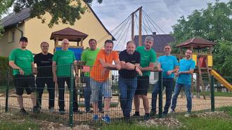 Bilder zeigen das neue Erscheinungsbild des Kinderspielplatzes und ein Teil der freiwilligen Helfer zu dieser Maßnahme.