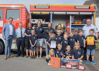 Sie standen im Mittelpunkt beim Tag der offenen Tür der Hoxeler Feuerwehr: die Kinder der Bambini-Feuerwehr Balkan - auf dem Bild mit ihrem Betreuerteam sowie Bürgermeister Andreas Hackethal und Wehrführer Wolfgang Schneider