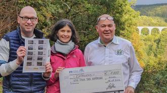 Carmen Arend und Marco Thees konnten VOR-TOUR Kümmerer Johnny Klein am Viadukt-Aussichtspunkt Ezenberg in Morscheid den Scheck für die gute Sache überreichen.