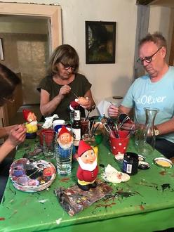 Samstagsmorgen stieß dann nochmals Klaus zu uns. Er wollte an diesem Tag unser Guide sein. Er begleitet uns auch zu unserem Zwergenmalkurs. Malen macht hungrig. Wir wurden zum Lunch bei Heike und Klaus gebeten. Im schönen Garten und bei frischer Luft schmeckt die Suppe einfach besser. Auch der selbstgebackene Kuchen war köstlich.