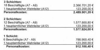 | Anmerkung: Bei der Ermittlung der Personalkosten wurde nur berücksichtigt, dass an jedem Tag die jeweilige Schicht besetzt ist, so dass bei Berücksichtigung von Urlaub, Krankheit und sonstigen Ausfallzeiten die Personalkosten noch wesentlich höher ausfallen werden. |
