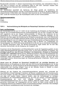 Zusammen mit den Steuerberatern und Wirtschaftsprüfern wurde die Fragestellung geklärt, ob eine weitere Betreibergesellschaft gegründet werden muss, um die neuen Windräder zu berteiben. Die einhellige Auskunft war, dass die neuen Windräder in der Bestehenden „Windpark am Ranzenkopf GmbH&Co.KG“ mitbetrieben werden können. Bedingung ist jedoch, dass sich die Anteilsstruktur der Gesellschafter nicht ändert. Als wichtige Einsparungen müssen in diesem Zusammenhang der entfallende zweite Wirtschaftsplan und Jahresabschluss gesehen werden, wie auch die nicht notwendigen internen Abrechnung wegen der Nutzung gemeinsamer Infrastruktur. Hierfür wurde einstimmig votiert.