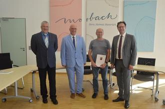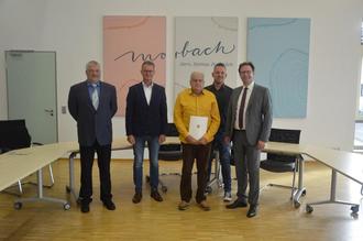 Personalratsvorsitzender Patrick Krickel, Abteilungsleiter Günther Alt, Jubilar Thomas Gauer und Bürgermeister Andreas Hackethal