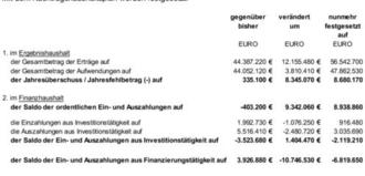 | Der Gesamtbetrag der Ermächtigungen zum Eingehen von Verpflichtungen, die in künftigen Haushaltsjahren zu Auszahlungen für Investitionen und Investitionsförderungsmaßnahmen (Verpflichtungsermächtigungen) führen können, wird festgesetzt von vorher 3.604.000,00 € auf | 3.380.000,00 €. |