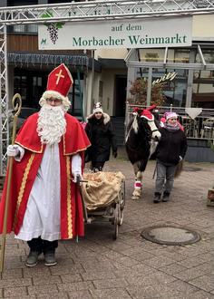 Am 05. und 06.12. fand am Unteren Markt im Ortsbezirk Morbach ein kleiner, aber feiner Weihnachtsmarkt statt. Bei winterlich trocken-kühler Witterung am Freitag Abend zeigte sich ein großer Besucherandrang, so dass die winterlichen Heißgetränke, Waffeln und deftige Speisen gut nachgefragt wurden. Dabei stimmte uns das Bläser-Ensemble des Musikvereins Morbach auf Weihnachten ein. Am Samstag Mittag kam der Nikolaus zu Besuch und konnte fast 100 Kindern eine Geschenktüte überreichen. Er und seine 2 weihnachtlich geschmückten tierischen Begleiter dienten vielen Kindern und Familien als adventliches Fotomotiv. Am Abend klang der Weihnachtsmarkt dann mit musikalischer Begleitung in großer, froher Runde aus.