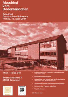 In diesem Jahr soll es soweit sein: Wir ziehen in unser neues Schulgebäude. Die Ära der Grundschule am Bodenländchen geht damit zu Ende. Mit einem Schulfest nehmen wir vorzeitig am 12.04.24 von 14 bis 19 Uhr Abschied von unserem alten Gebäude. Wir laden alle herzlich ein, mit einem bunten Programm, (Verkaufs)Ausstellungen, einer Tombola und vielen Spieleständen mit uns zu feiern und Rückschau auf die vergangenen knapp 50 Jahre zu nehmen.