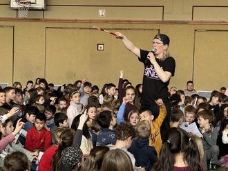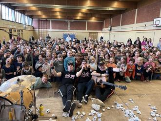 Das macht Laune: Julia Reidenbach reiste mit ihrer Band ans Bodenländchen und brachte die Halle zum kochen. 370 Kinder mit ihren Lehrkräften tanzten und sangen, was das Zeug hielt. Ob Rock oder Kanon, ob Springen oder Klatschen: Das Publikum fraß der sympathischen Powerfrau aus der Hand. Ihre wundervolle Stimme wurde dabei von Stefan am Schlagzeug und Christoph an der Gitarre famos in Szene gesetzt. Aber auch für jeden „Pupes“, den Julia anzettelte, waren die beiden sofort zur Stelle. Nach 60 Minuten war auch den Letzten im Saal klar: Just sing, dann geht’s dir besser! Vielen Dank an die Band und den Förderverein, der die Aktion komplett finanzierte.