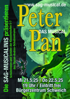gerne möchten wir Sie auch in diesem Schuljahr zu unserem Musical einladen. Die Musicalinis sind schon ganz aufgeregt, weil sie Ihnen das Musical „Peter Pan“ präsentieren dürfen. Das Musicalini-Ensemble des Stefan-Andres-Schulzentrums Schweich sind Schülerinnen und Schüler der Klassenstufen 5-7. Unterstützt werden sie von fleißigen größeren Schülerinnen und Schülern hinter der Bühne. Alle Schülerinnen und Schüler haben voller Eifer Bühnenbilder gebaut, Kostüme zusammengestellt, technisch gearbeitet und geprobt, geprobt, geprobt, um Sie auch in diesem Jahr in ein Märchenland zu entführen. Die Geschichte ist jedem bekannt, doch lassen Sie sich überraschen von Ohrwürmen, großer Spielfreude und der Tatsache, dass Kinder nicht nur Kindern, sondern vor allem auch den Erwachsenen viel beibringen können. Das Musical "Peter Pan" wird am 21. und 22.05.2025 jeweils um 19 Uhr im Bürgerzentrum Schweich aufgeführt. Einlass ins Foyer ist bereits um 18 Uhr. Dort können Sie es sich noch mit Getränken und kleinen Snacks gut gehen lassen. Die Schülerinnen und Schüler würden sich über Ihren Besuch sehr freuen! Der Eintritt ist frei.