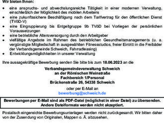 Die Verbandsgemeinde Schweich an der Römischen Weinstraße sucht zum nächstmöglichen Zeitpunkt für den Fachbereich 3/Bürgerdienste im Sachgebiet Kindertagesstätten
