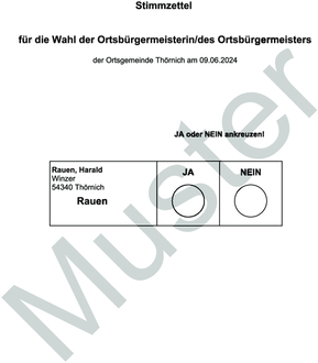 Nachstehend sind Muster der Stimmzettel für die Ratswahlen (Verbandsgemeinderat, Ortsgemeinderäte, Stadtrat, Ortsbeiräte) und die Direktwahlen (Orts-/Stadtbürgermeister/innen, Ortsvorsteher) abgedruckt.