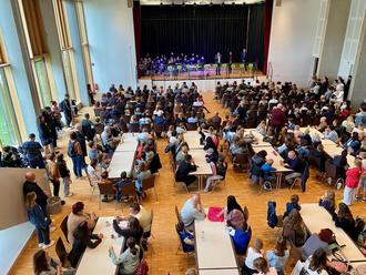 Schulleiter Herr Knobloch sagte zur Begrüßung, dass man hier im Saal gefühlt nicht nur so viele Schülerinnen und Schüler wie sie als Gesamtzahl in einer Grundschule sind habe, sondern so viele Schülerinnen und Schüler wie in 2-3 Grundschulen. Eine passende Beschreibung, denn das Bürgerzentrum war mit den kommenden Fünftklässlern und ihren Eltern an diesem Tag bis an den Rand gefüllt.